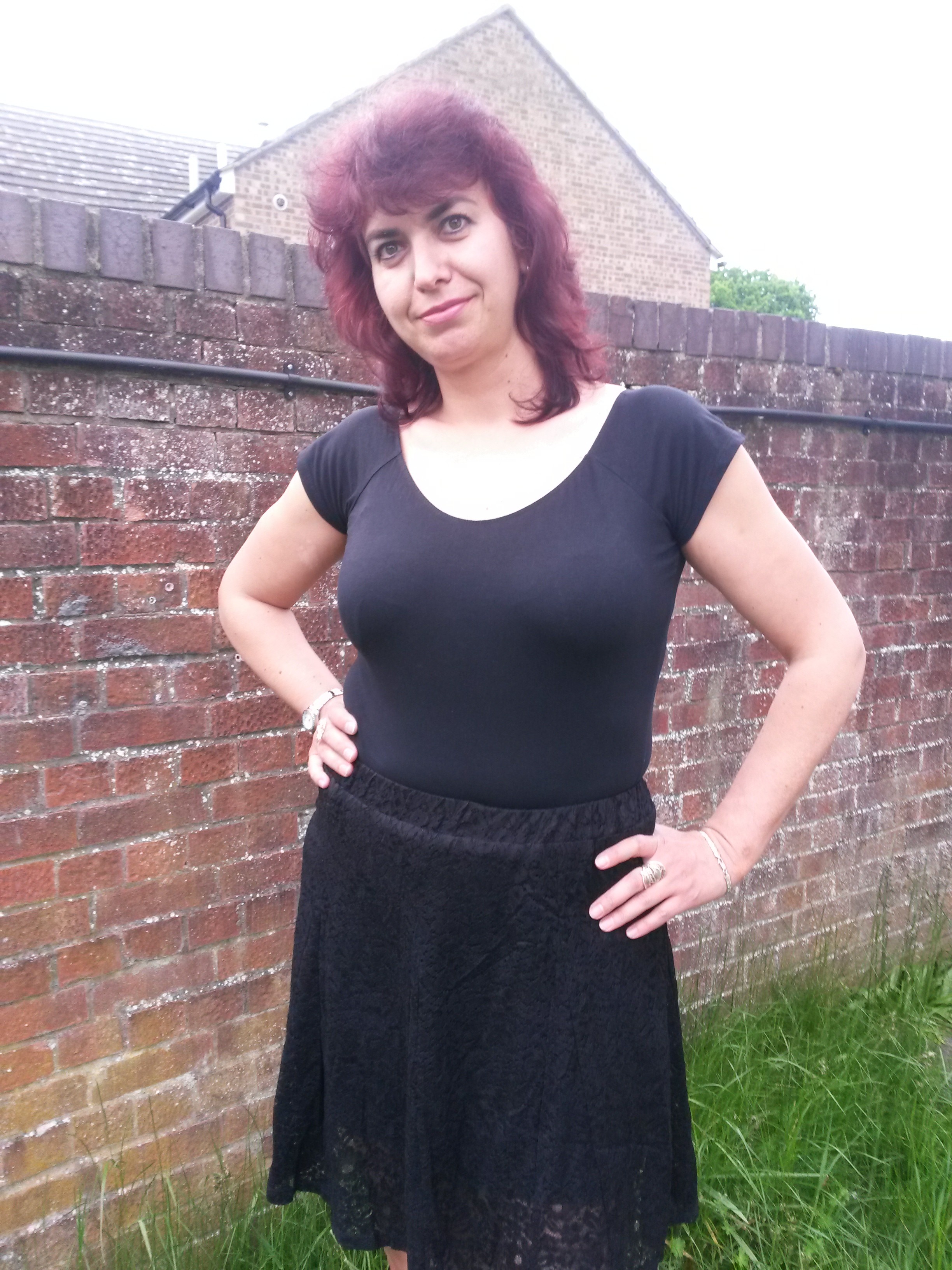 I must say it’s the lowered price (£20) that attracted me to give this dress a go, but it turned out to be a really lovely piece. While the top is made of jersey (viscose plus spandex) that shapes the upper body quite nicely, the skirt is made of sheer woven viscose that accentuates the curves and hides any imperfections. Sexy and elegant, it can be dressed up or down. I like it with a leather jacket: