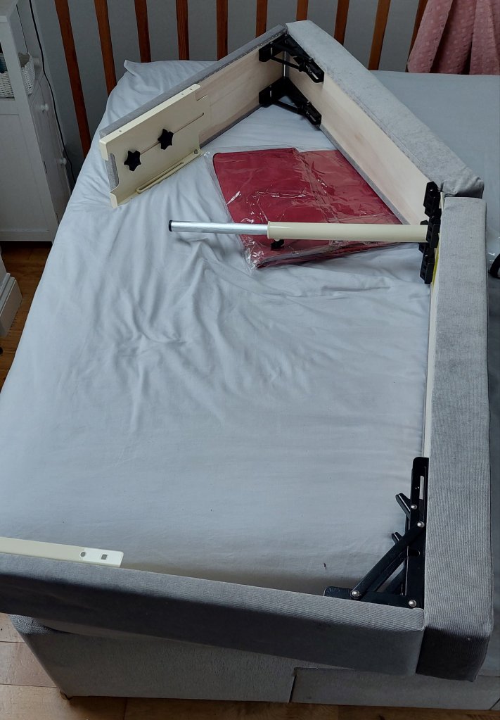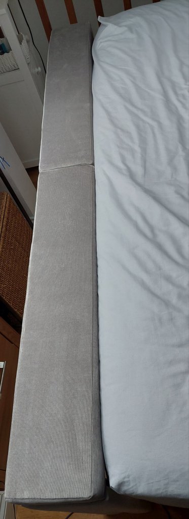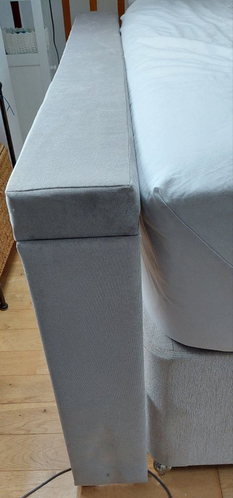 It is, basically, a free standing supported shelf that gets attached to the head end of your bed. It comes in a variety of colours to match the colour of your bed base, but also with its own sheet, so you don’t have to worry about having to source yet bigger and longer bedsheets.